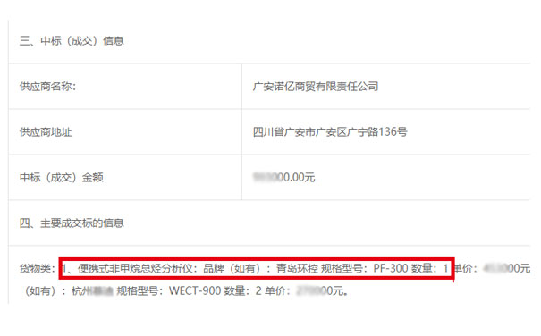 主要成交標(biāo)的信息貨物類:1、便攜式非甲烷總烴分析儀:品牌:青島環(huán)控 規(guī)格型號(hào):PF-300 數(shù)量:1 。
